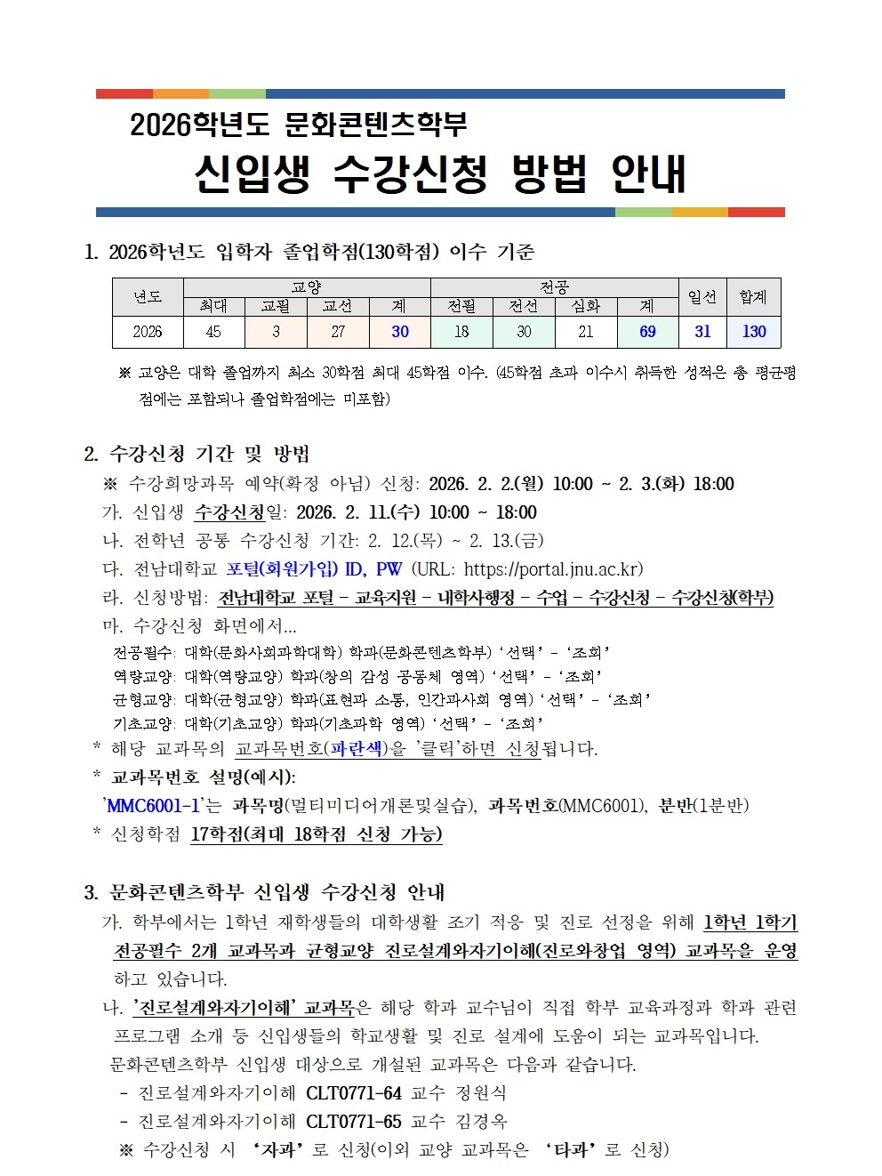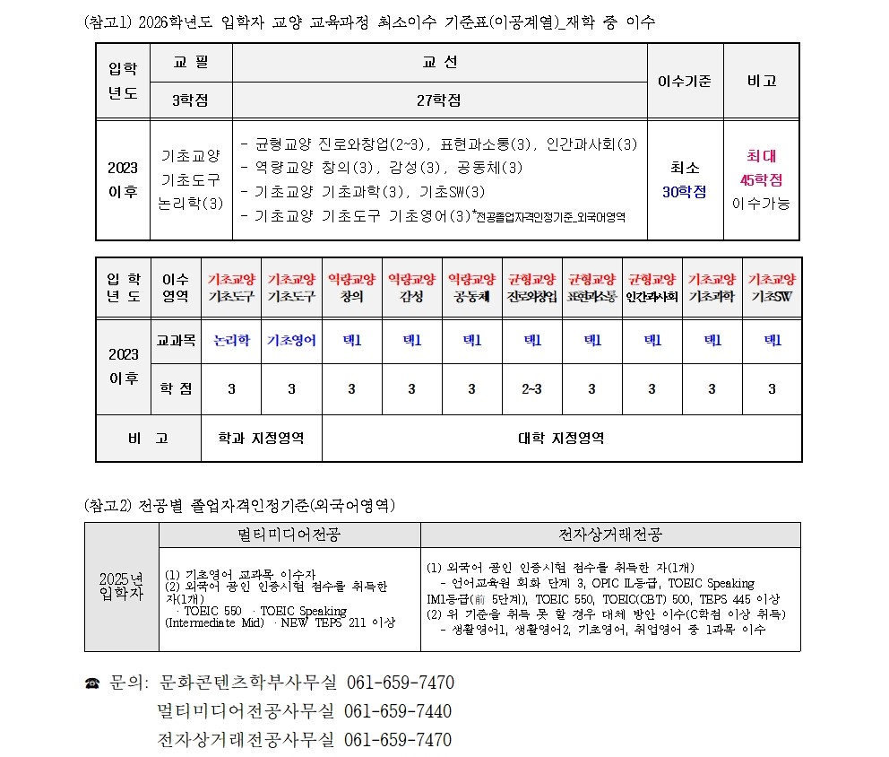 2026학년도 문화콘텐츠학부 신입생 수강신청 방법 안내