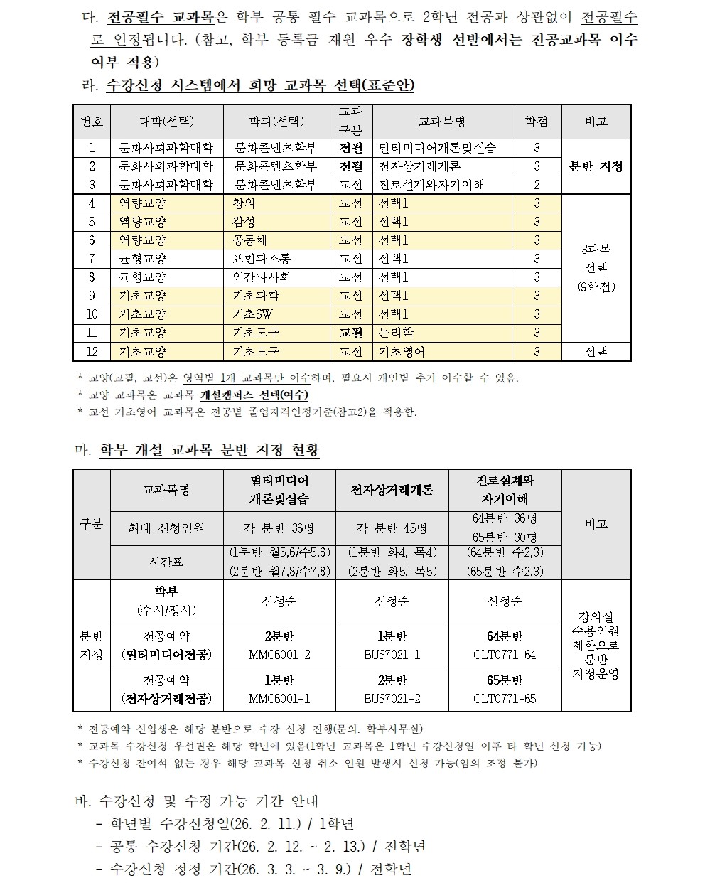 2026학년도 1학기 수강신청 안내